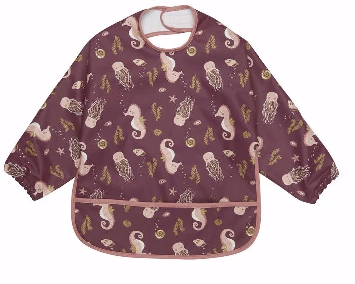 Praktisches Celavi Ärmellätzchen mit langen Ärmeln. Der schöne weinrote Farbton mit dem Seepferdchen-Motiv ist ideal für kleine Mädchen, die das Essen üben möchten.