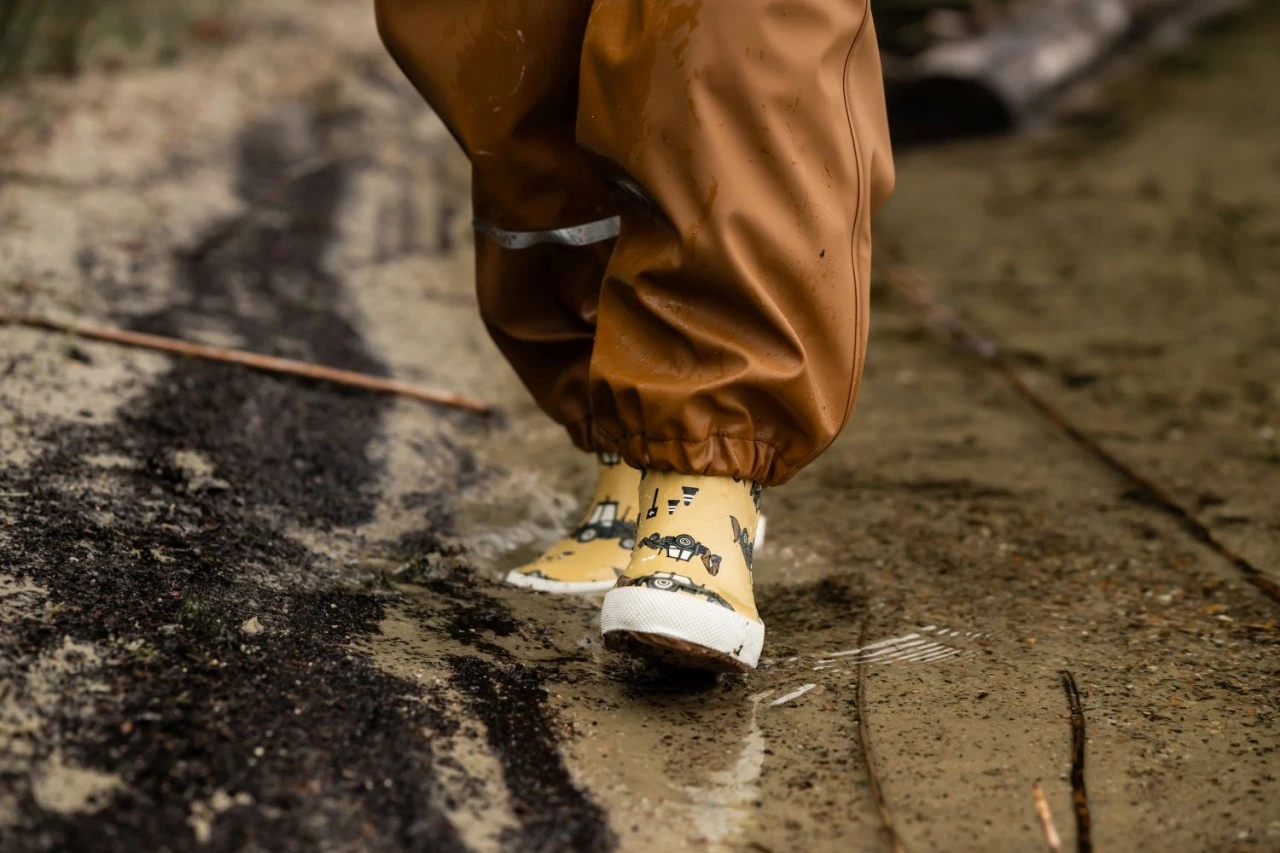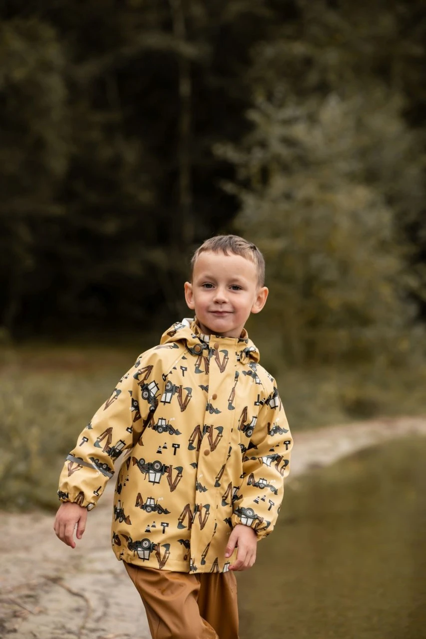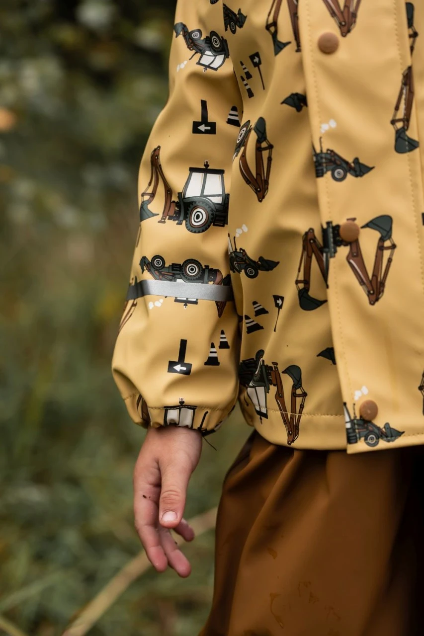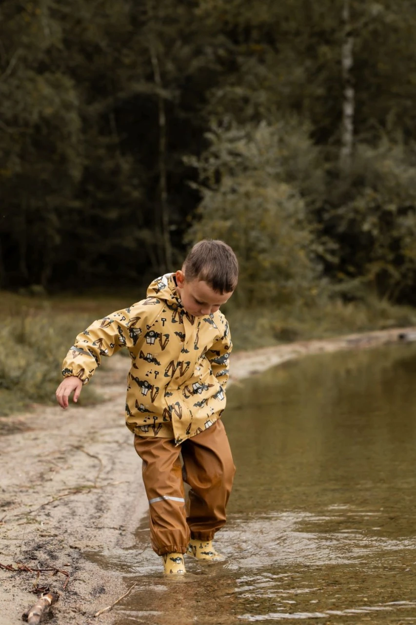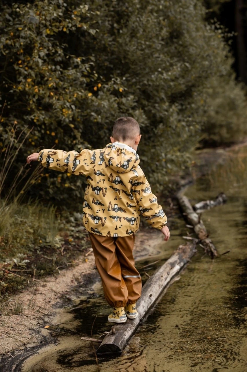 Wasserdichtes Celavi Regenoutfit für Kinder. Das strohgelbe Motiv mit dem Baggerlader Traktor gefällt sicher allen kleinen Pfützenspringern. Da kann es Bindfäden regnen – im Celavi Regenanzug können die Kleinen unbeschwert draußen toben und spielen. Das Set besteht aus Regenjacke und nougatbrauner Regenhose. Ideal für den Kindergarten und Spielplatz. Wasserdicht, bequem geschnitten und klein zusammenlegbar.