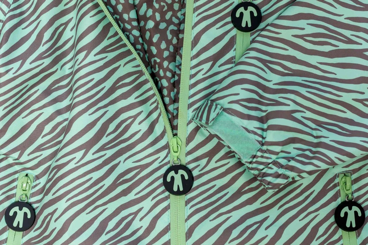 Praktischer wasserdichter Matschoverall von Ducksday. Der Regenanzug Okapi hat ein schönes Muster in zartgrün/braun. Der ideale Regenoverall zum Drüberziehen als Schmutz und Nässeschutz für den Spielplatz, Sandkasten, Kindergarten oder zum Fahrradfahren.