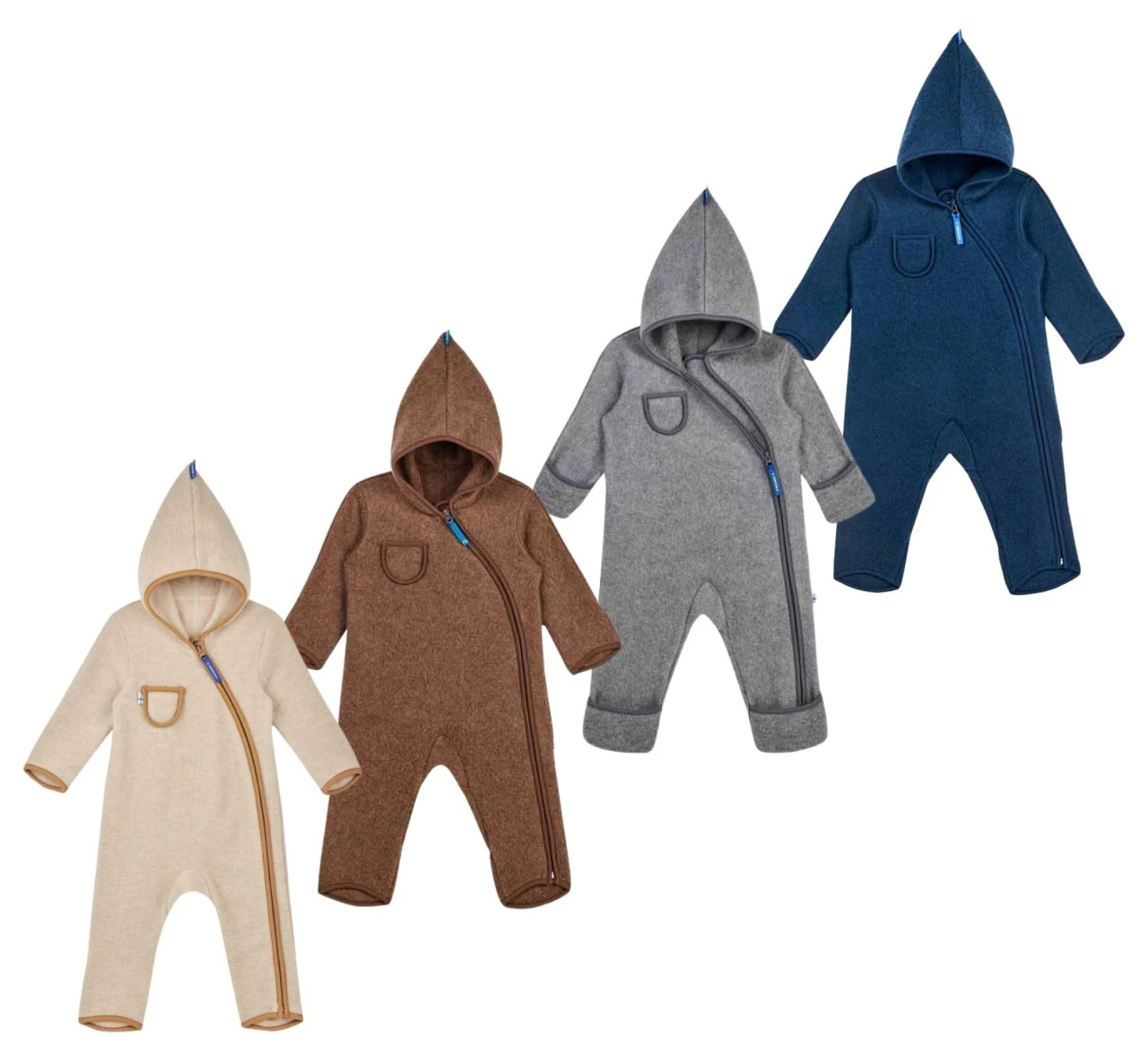 Kuschelwarmer Finkid Thermoanzug aus weichem Wollfleece. Der verwendete Wollfasermix mit einem Schurwollanteil von 80% hält schön warm und kratzt nicht. An den Ärmelenden und Beinabschlüßen sind kleine Umklapptaschen integriert, dadurch kühlen kleine Babyhände und Babyfüßchen nicht aus. Die süße Zipfelkapuze schützt Babys Kopf und Nacken vor Kälte.