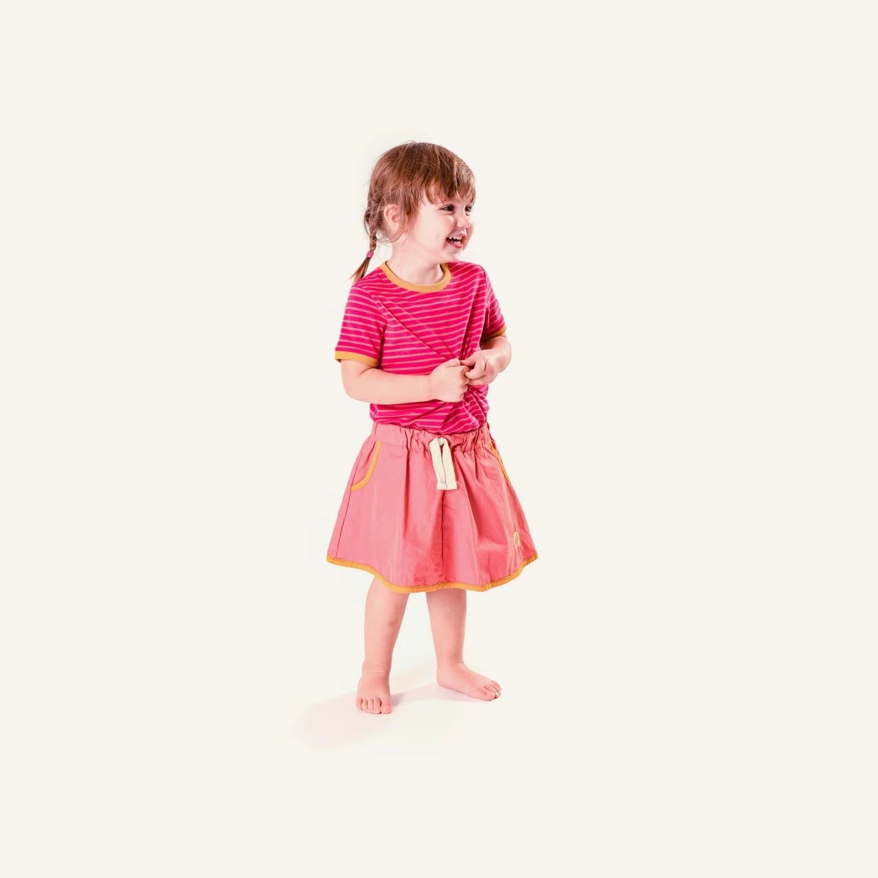 Hübsches geringeltes Mädchen T-Shirt mit Rundhals und schmalen Rippbündchen. In fröhlichem Ringeljersey oder mit Tier-Print ein echter finkid-Klassiker. Die Ziernähte an den Seiten verleihen den finkid-typischen Farbkontrast.