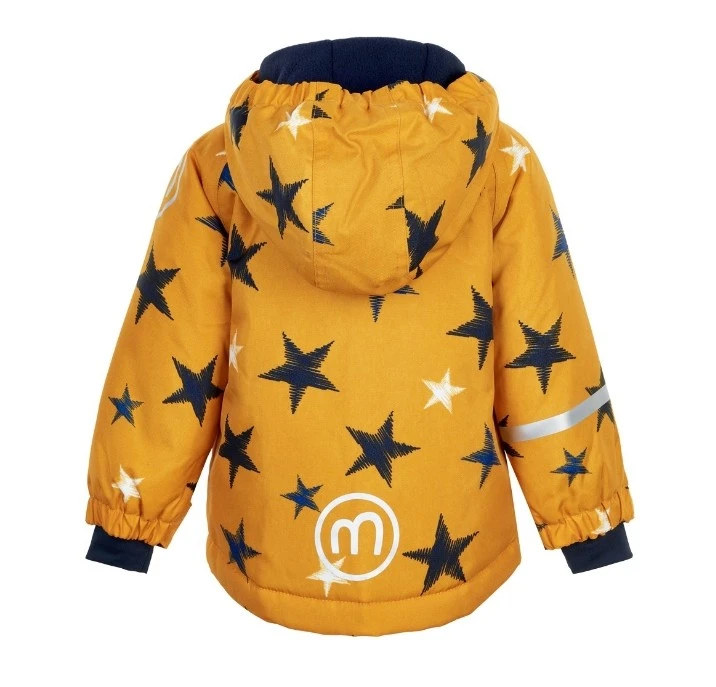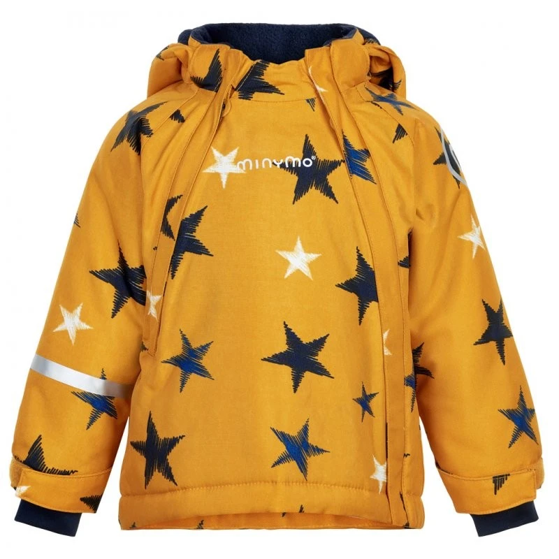 Warme Winterjacke in maisgelb mit blauen Sternen. Die schöne Outddorjacke ist mit Doppelzipper ausgestattet. Dadurch geht das An- und Ausziehen ganz einfach und schnell. Minymo Winter-Jacken geben Schutz vor Wind und Winterkälte. Die NUMMER 1 unter unseren wasserdichten und atmungsaktiven Kinder Outdoor-Jacken