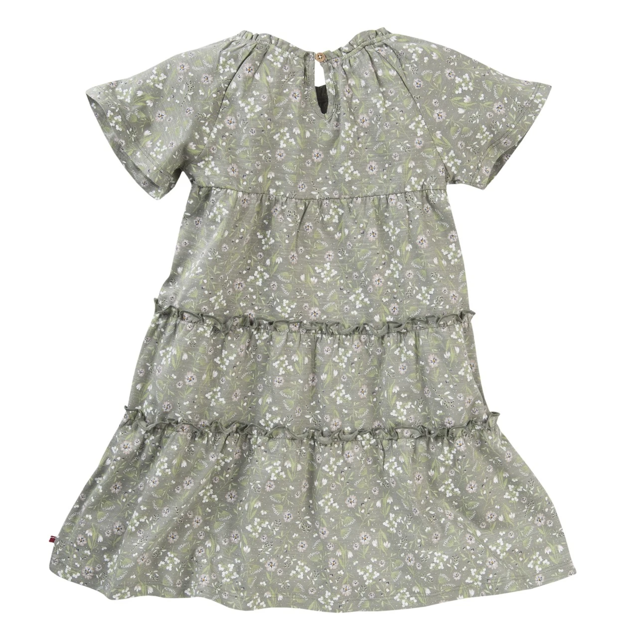 Schwungvolles Baumwollkleid für kleine Mädchen. Luftiges Stufenkleid mit kurzen Raglan-Ärmeln, detailverliebter All-over-Print „Frühlingswiese“ auf khaki Grundstoff. Der bequeme Schnitt engt nicht ein und gibt viel Bewegungsspielraum. Für leichtes An- und Ausziehen, ist im Nacken ein Knopfverschluß angebracht. Ein schickes Stufen-Kleidchen aus Bio-Baumwolle, das sehr gut auch zu besonderen Feierlichkeiten getragen werden kann