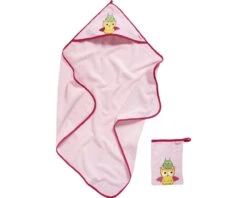 Zweiteiliges Frottee-Geschenkset mit süßen Eulen. Das praktische Kapuzentuch aus saugfähigem Baumwoll-Frottee trocknet und wärmt das Kind nach dem Baden oder Schwimmen. Praktisch für zu Hause, am Strand oder im Schwimmbad. Die in der Ecke angebrachte Kapuze paßt genau über den Kopf und erleichert das abtrocknen.